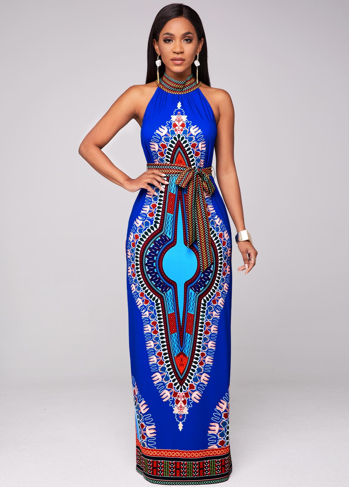 • Belted Dashiki Print Bib Neck Maxi Dress