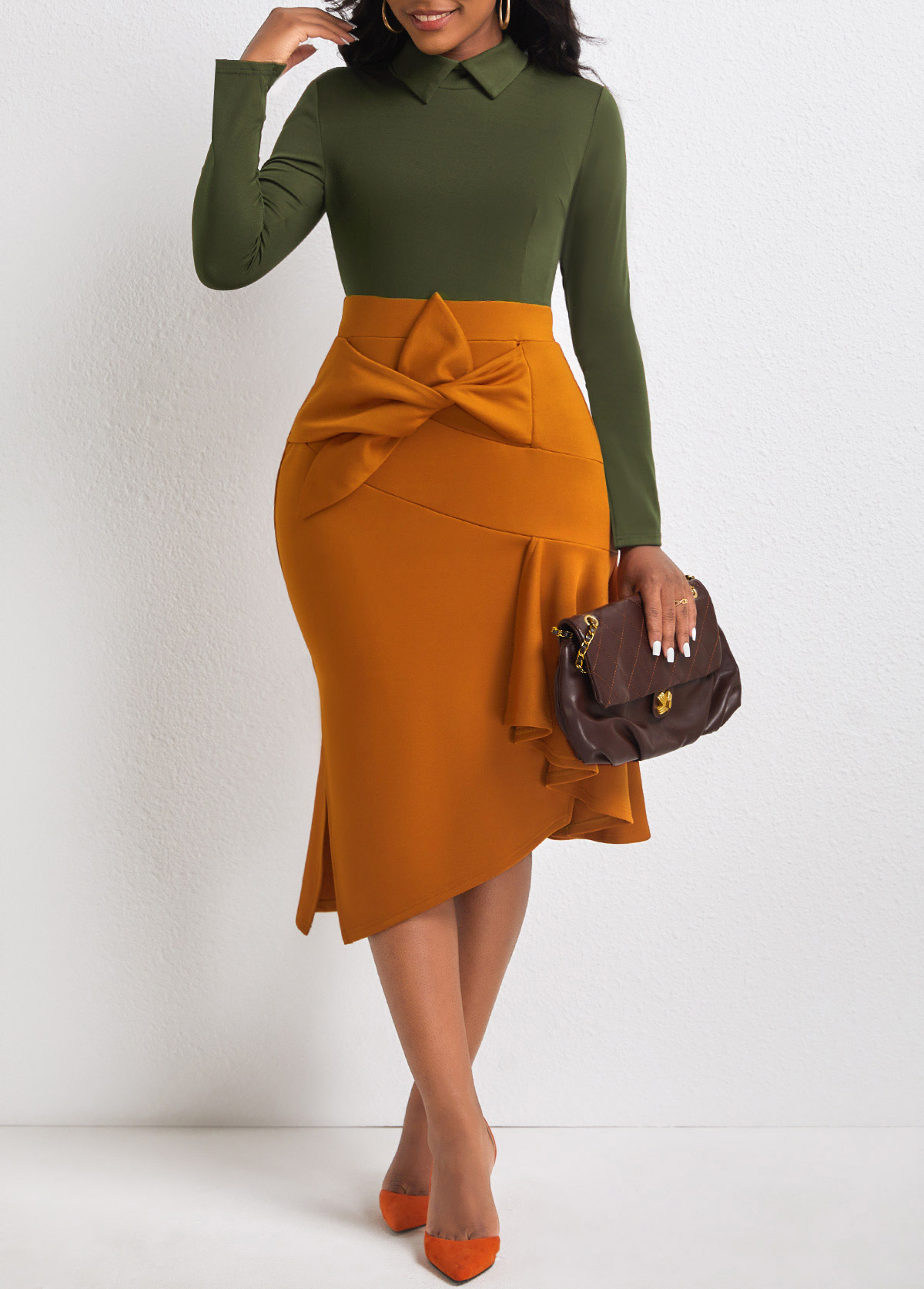 • Blackish Green Contrast Bowknot Side Slit Dress