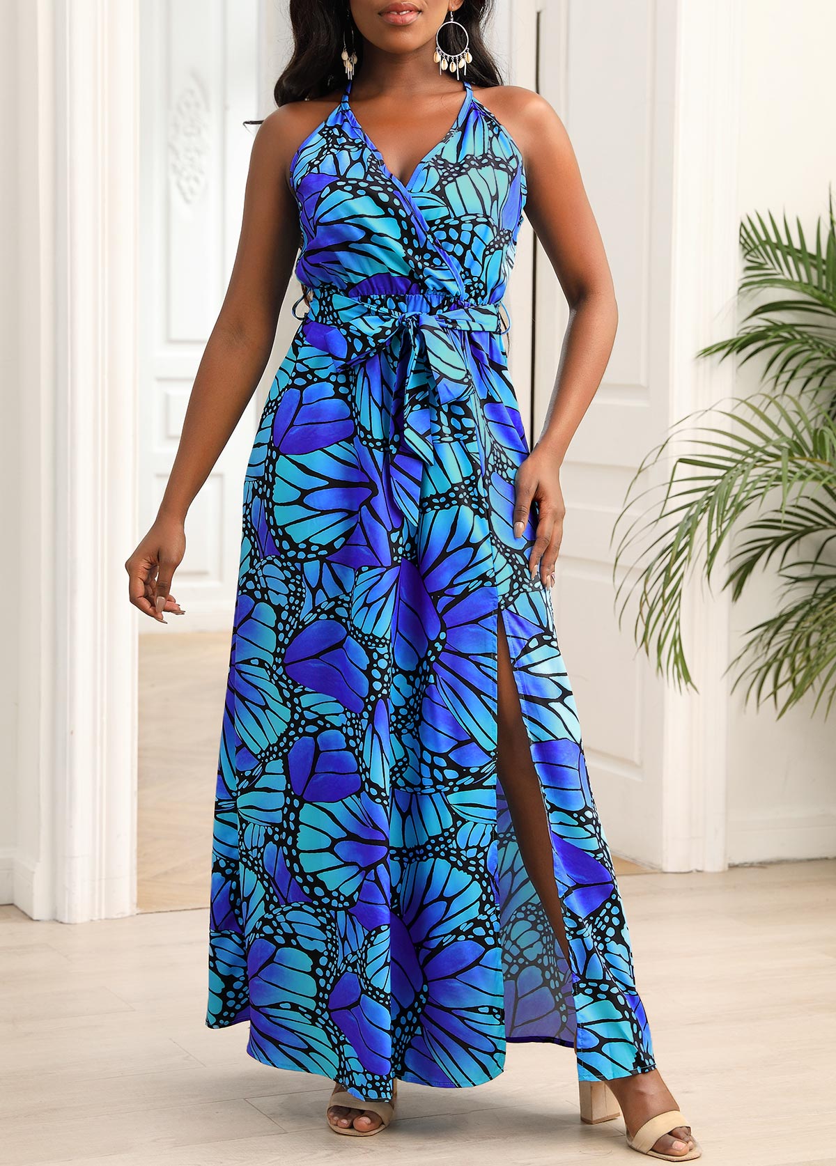 • Blue Belted Butterfly Print Spaghetti Strap Dress
