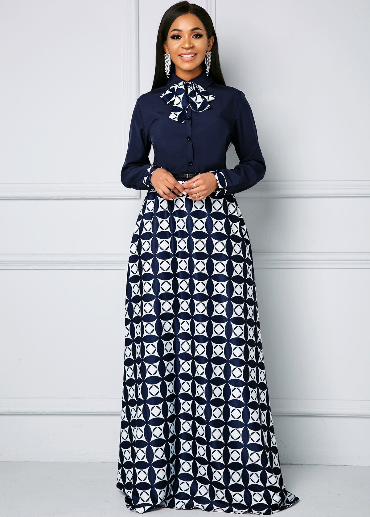 Bowknot Long Sleeve Geometric Print Maxi Dress