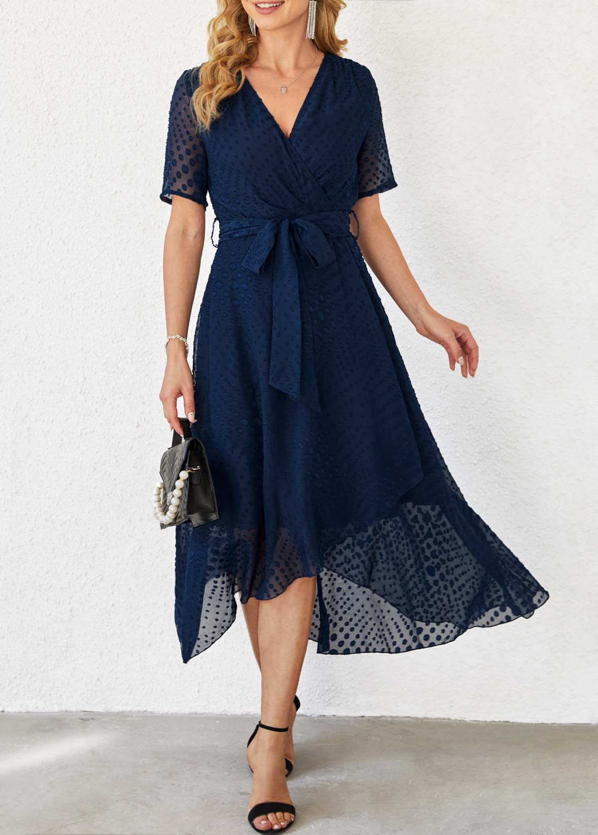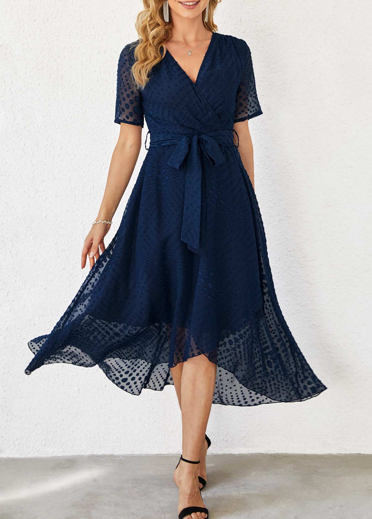 • Chiffon Cut Flowers Belted Navy Blue Dress