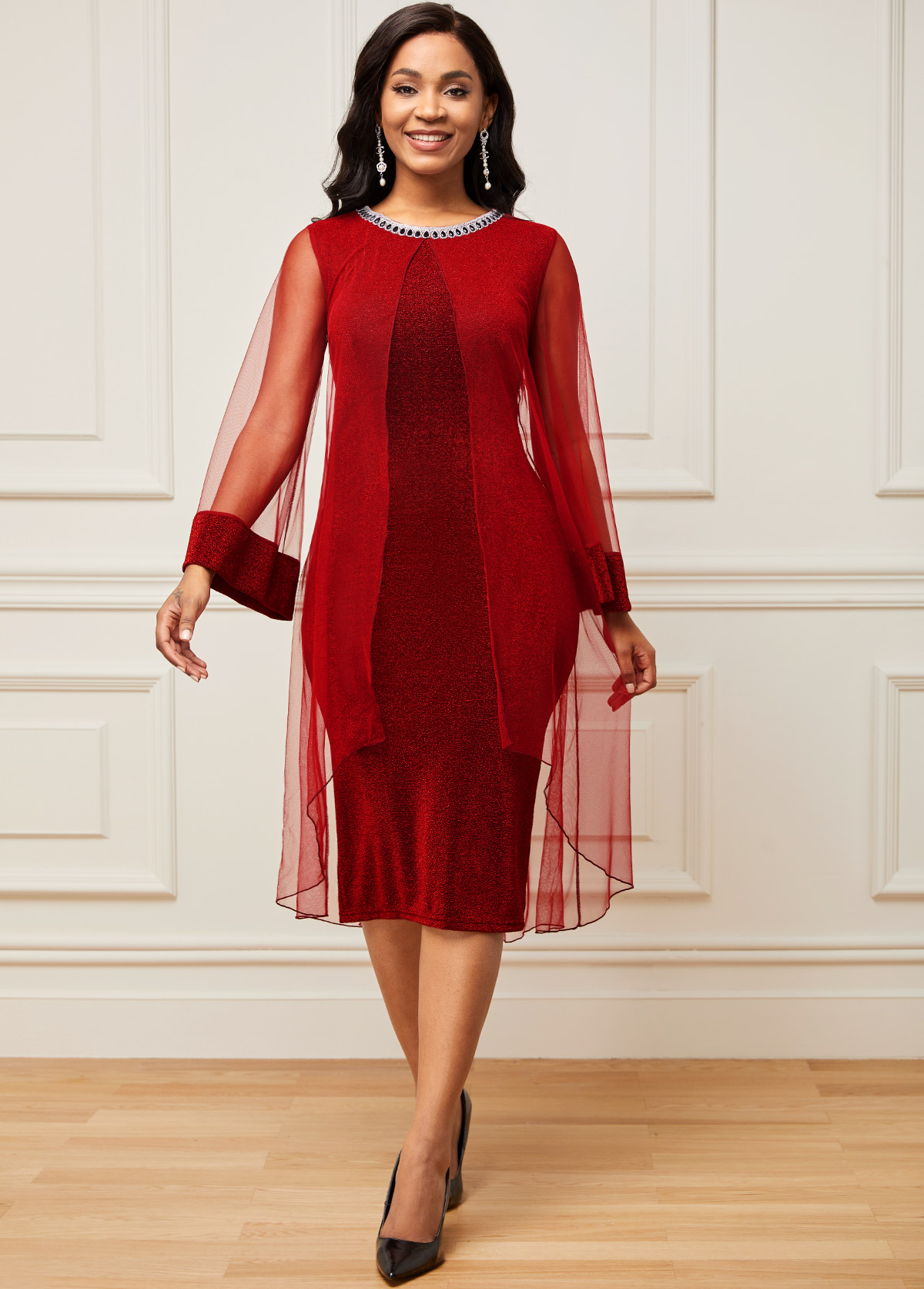 • Chiffon Mesh Stitching Wine Red Embellished Neck Dress