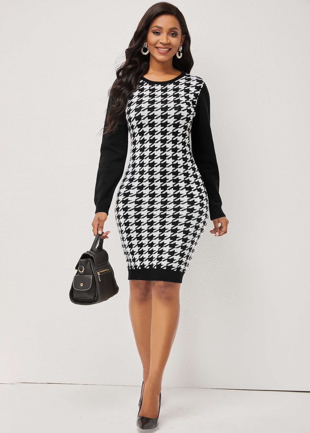 • Color Block Houndstooth Print Long Sleeve Sweater Dress