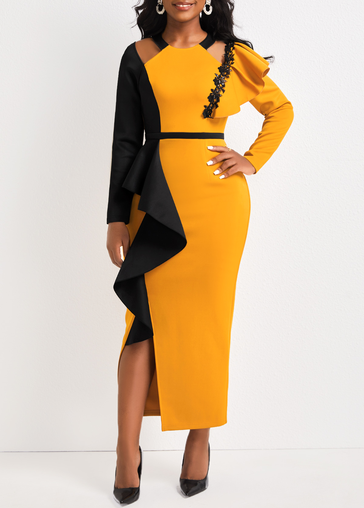 • Contrast Color Ruffle Yellow Bodycon Dress