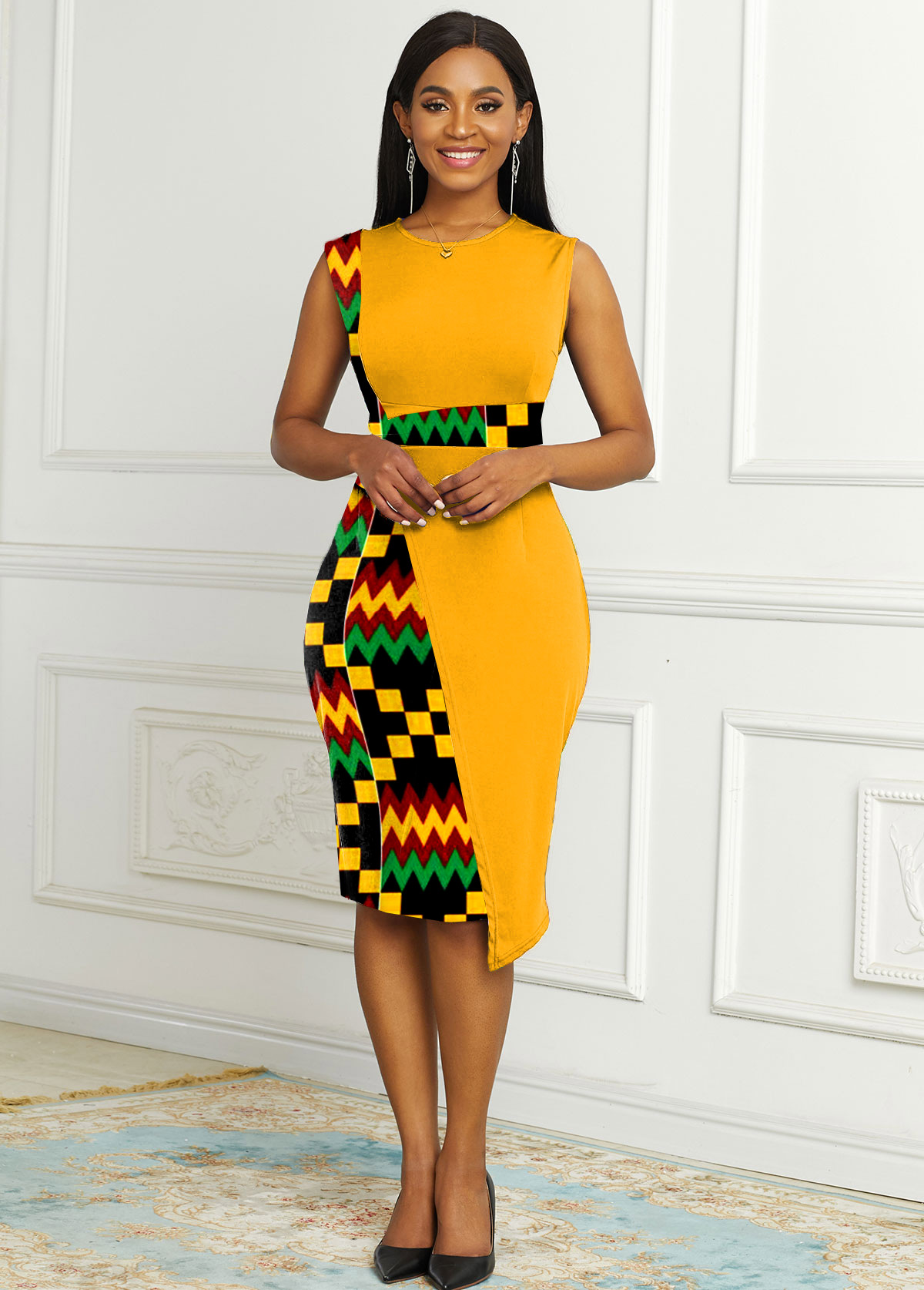 • Contrast Round Neck Tribal Print Dress
