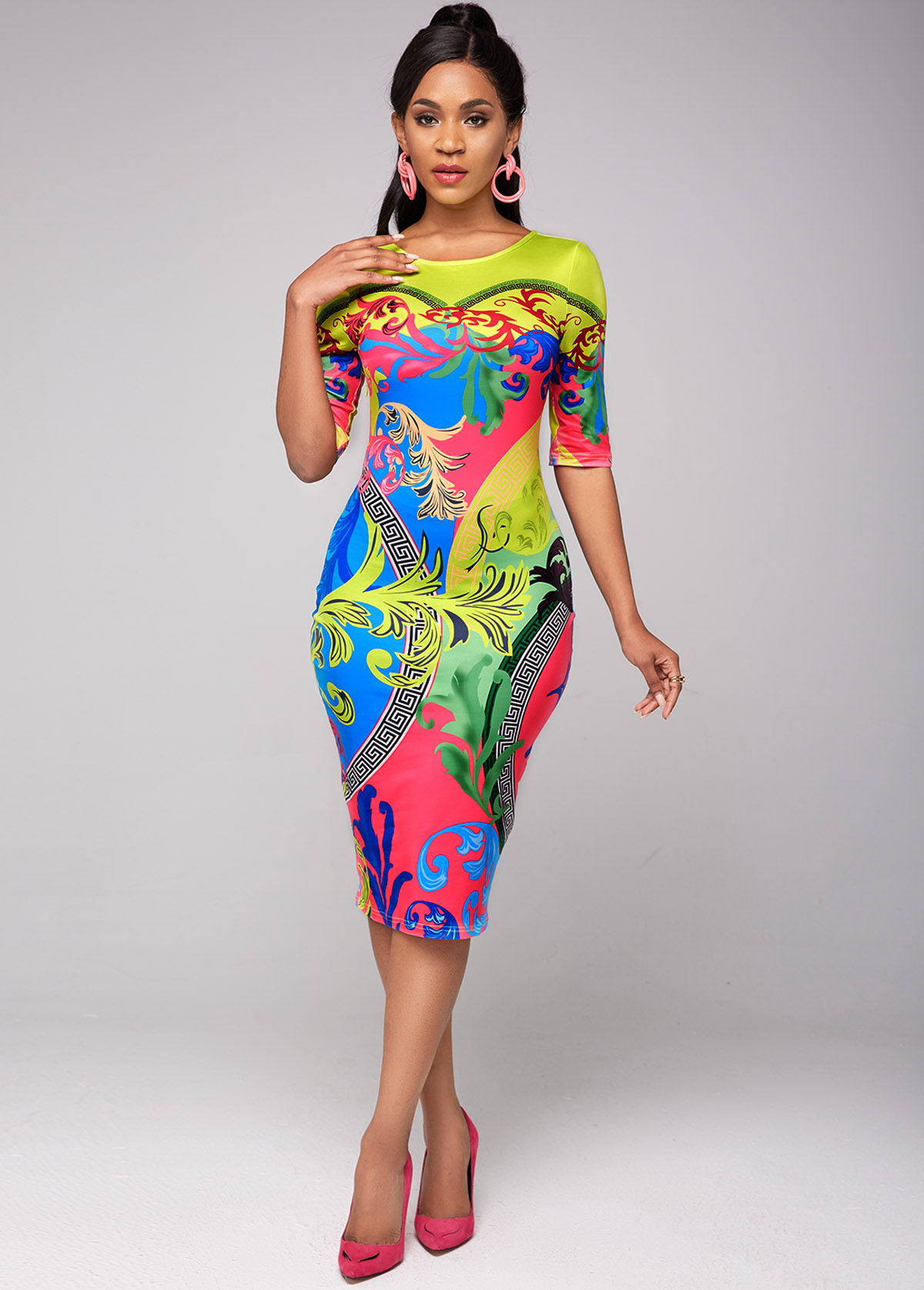 • Half Sleeve Tribal Print Round Neck Dress
