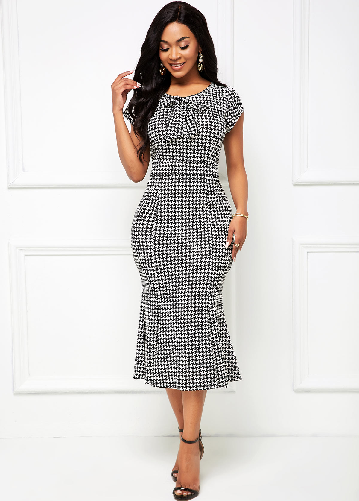 Houndstooth Print Bowknot Detail Mermaid Dress