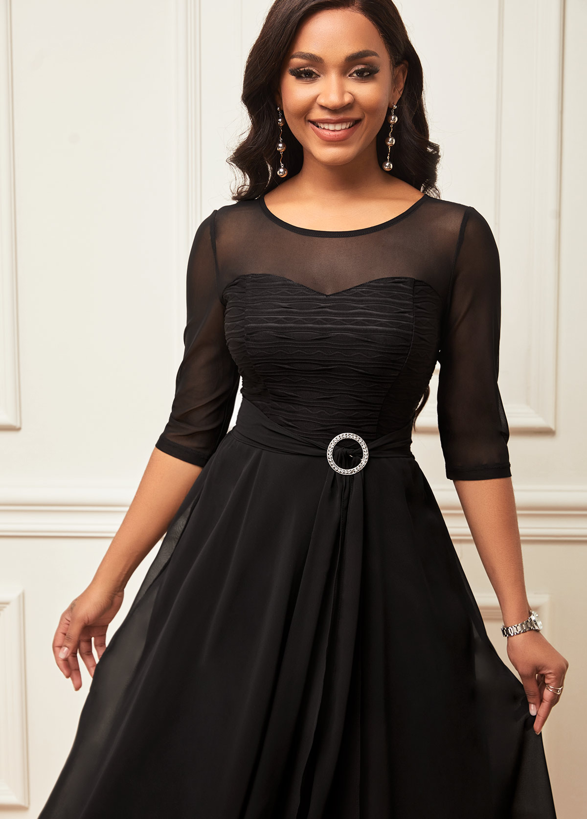• Layered Hem Chiffon 3/4 Sleeve Black Dress