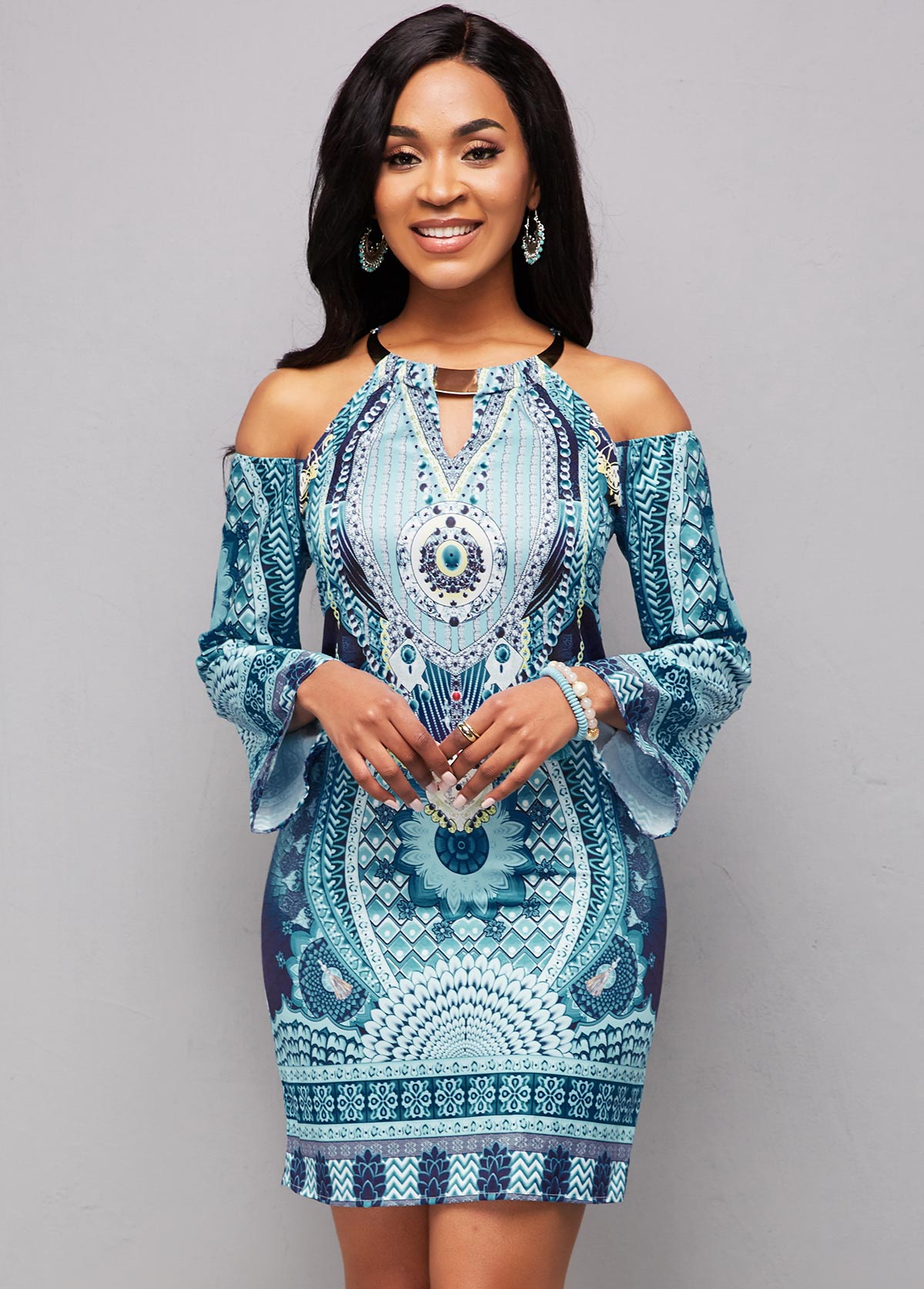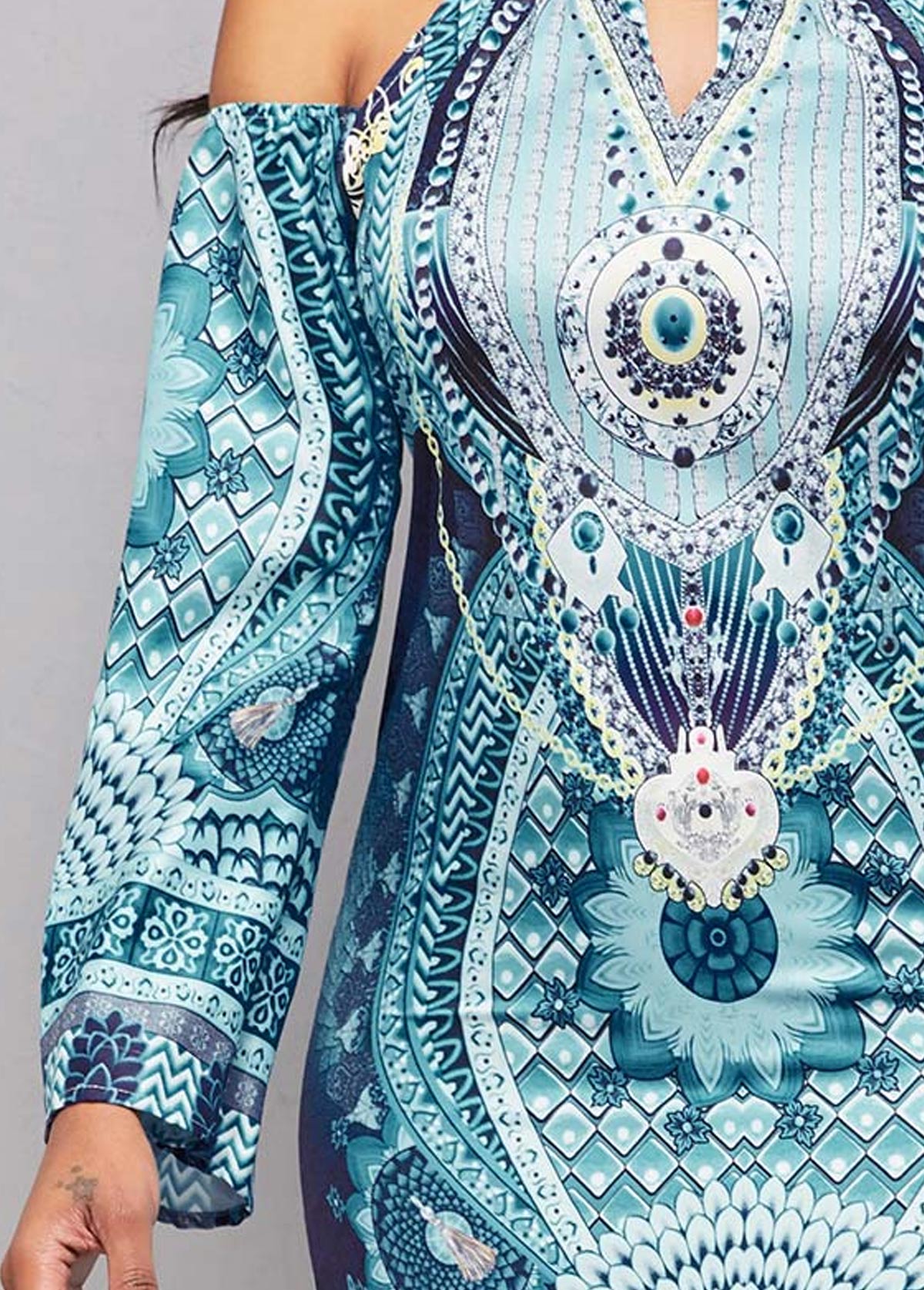 • Long Sleeve Bib Neck Tribal Print Bodycon Dress