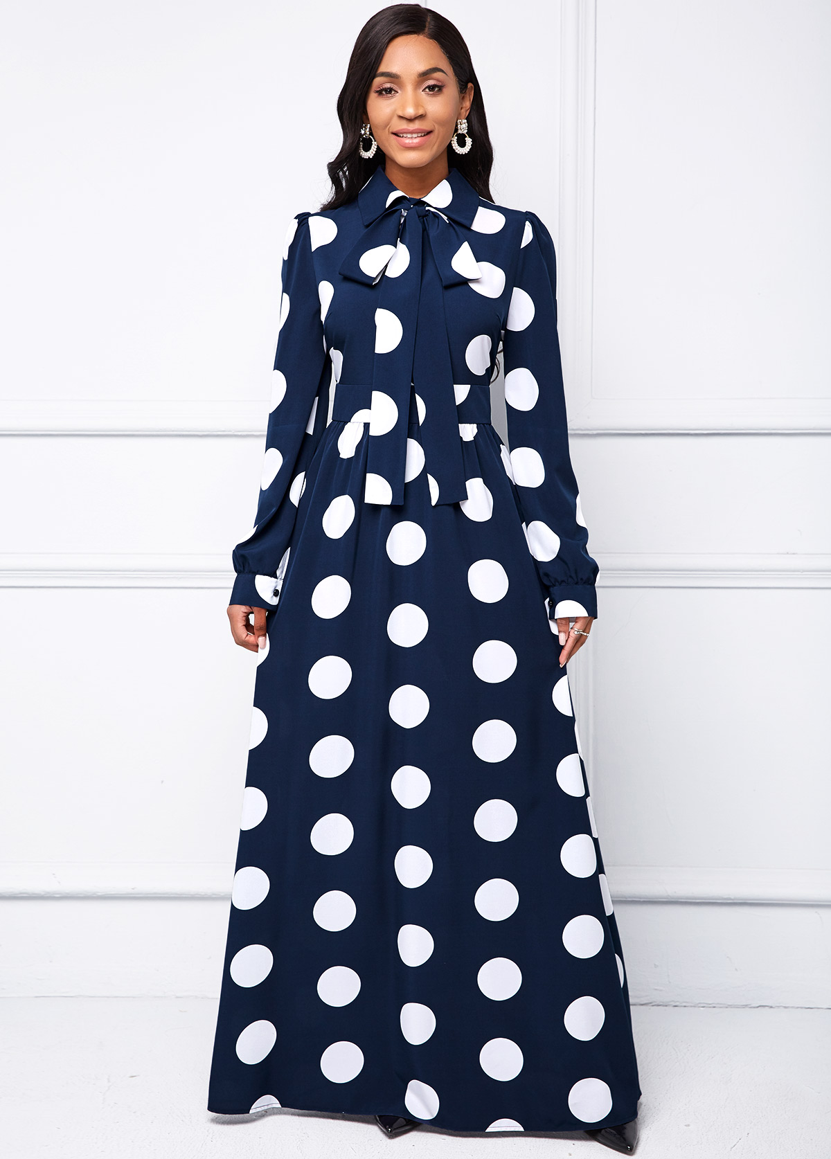 • Long Sleeve Turndown Collar Polka Dot Dress