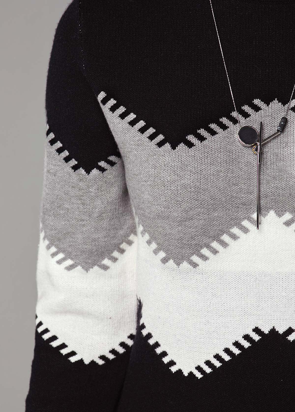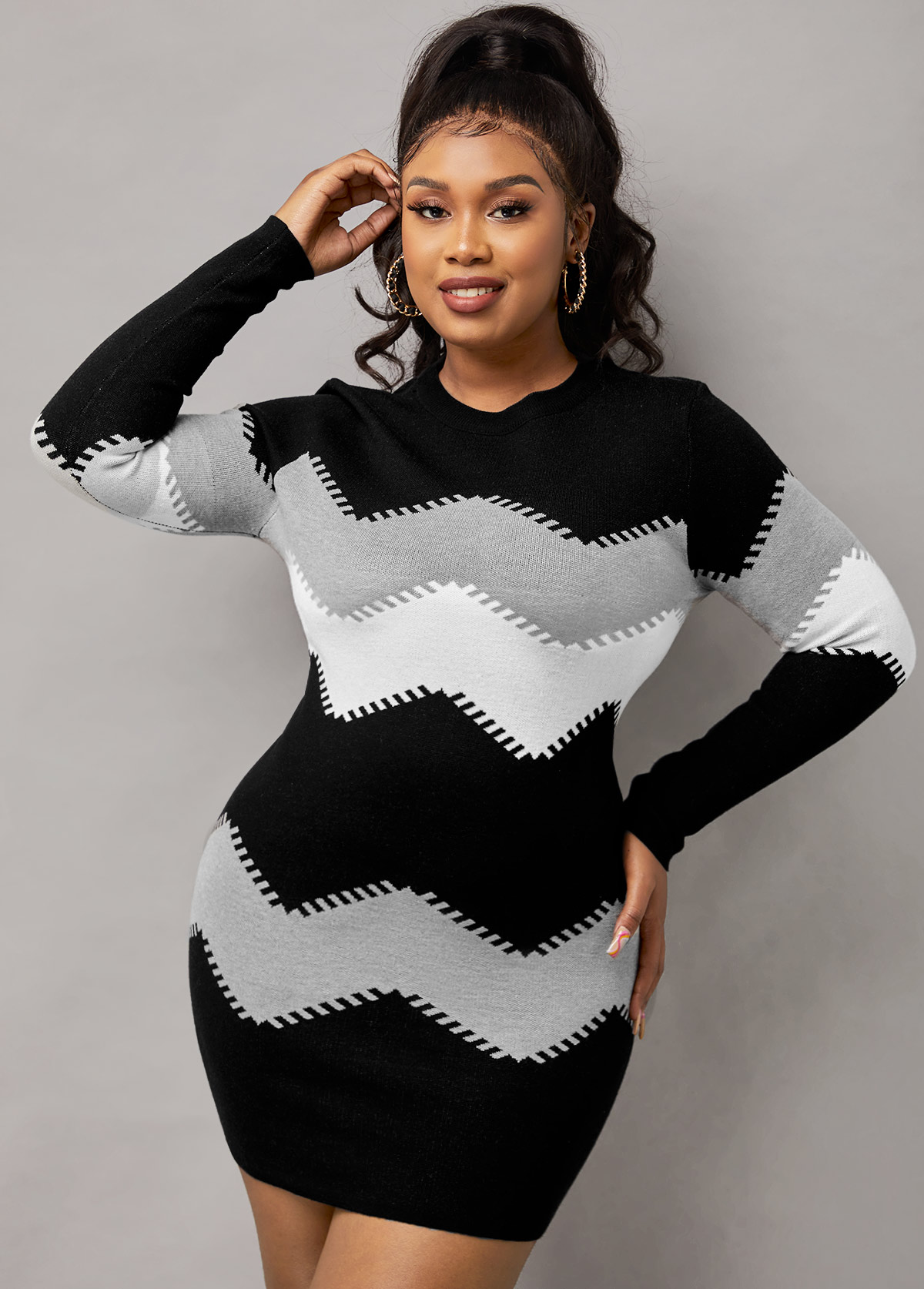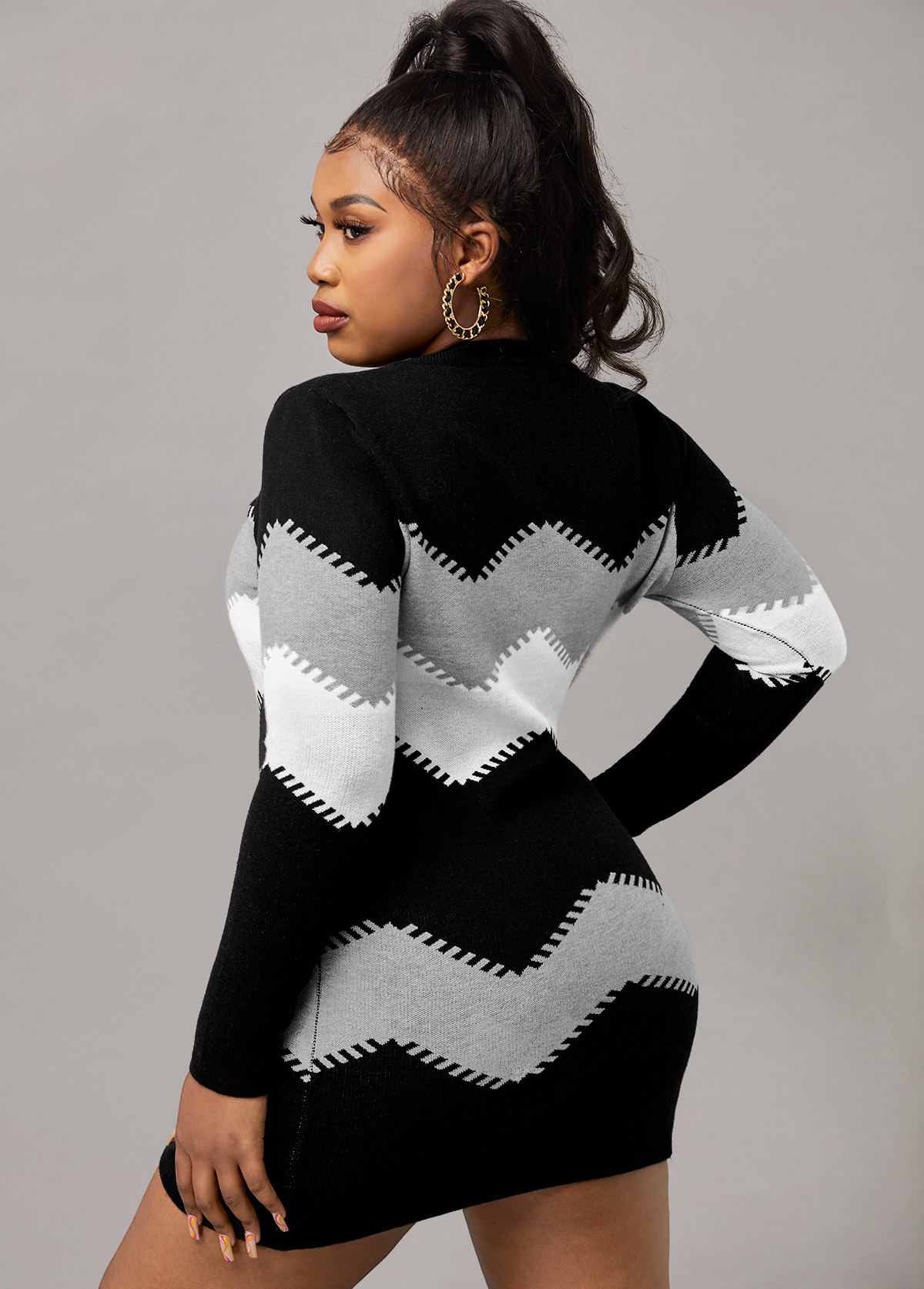 Mock Neck Long Sleeve Chevron Pattern Sweater Dress