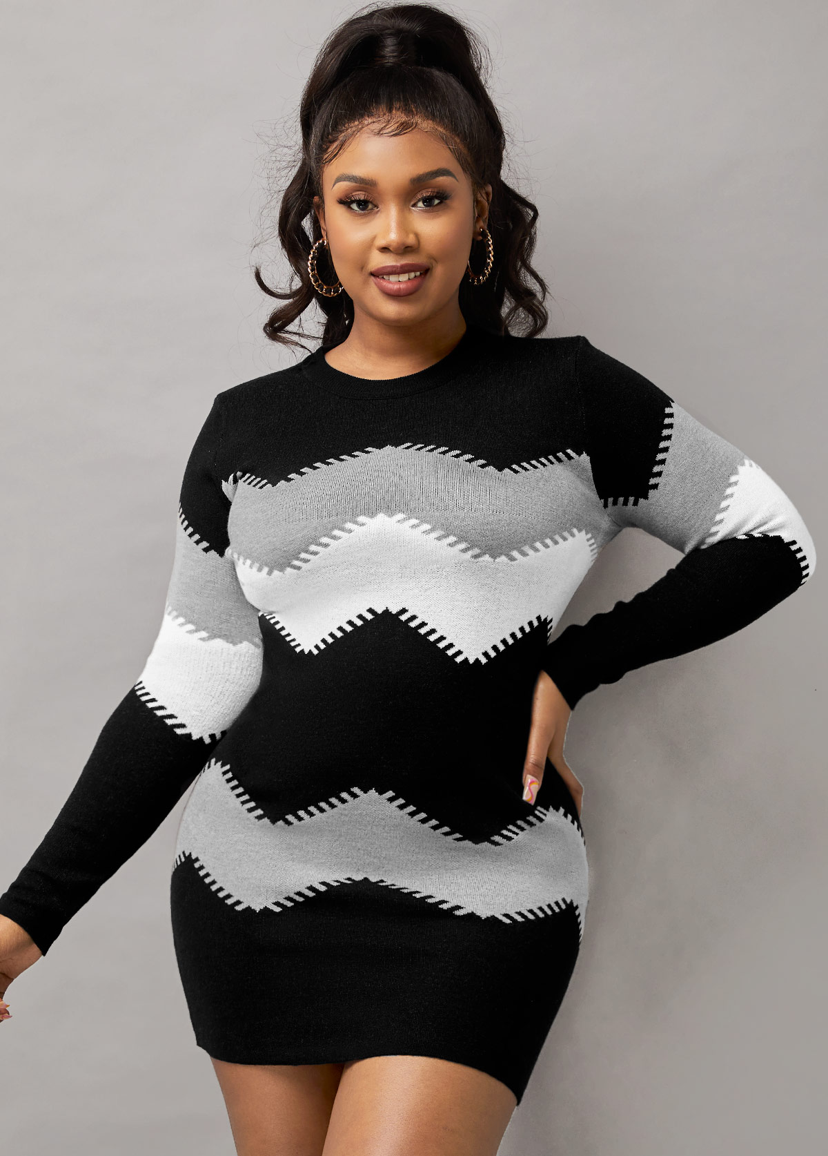 • Mock Neck Long Sleeve Chevron Pattern Sweater Dress