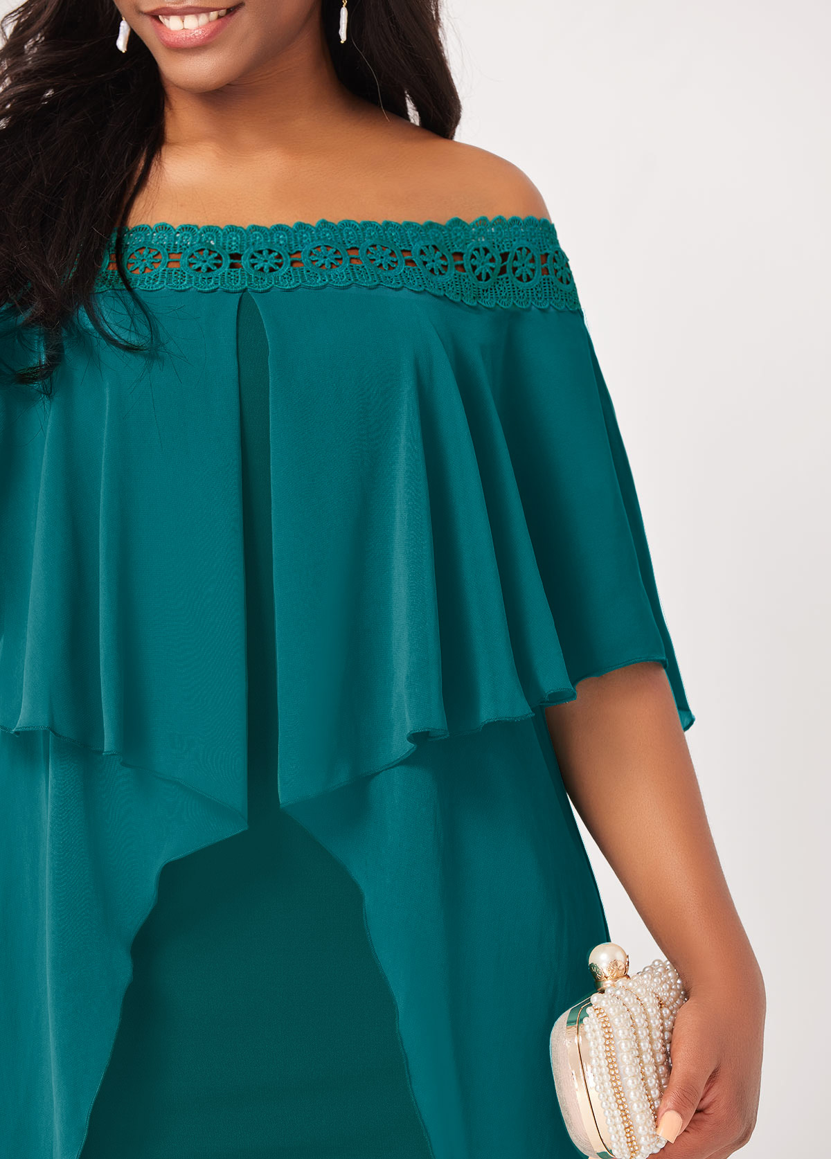 Off Shoulder Lace Stitching Flounce Turquoise Dress