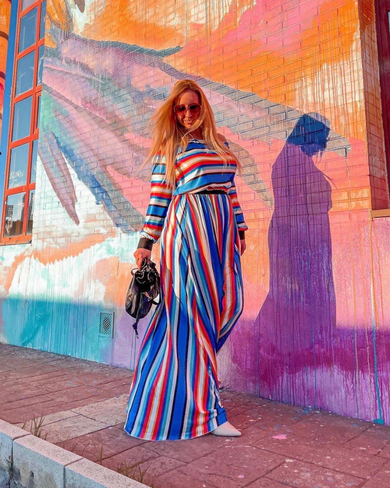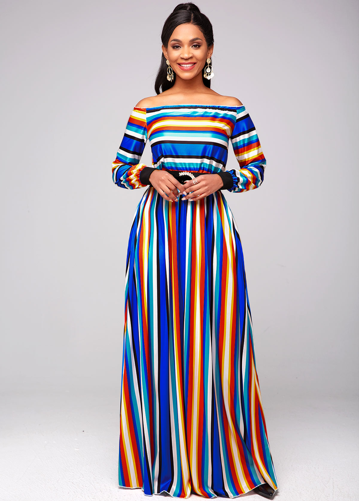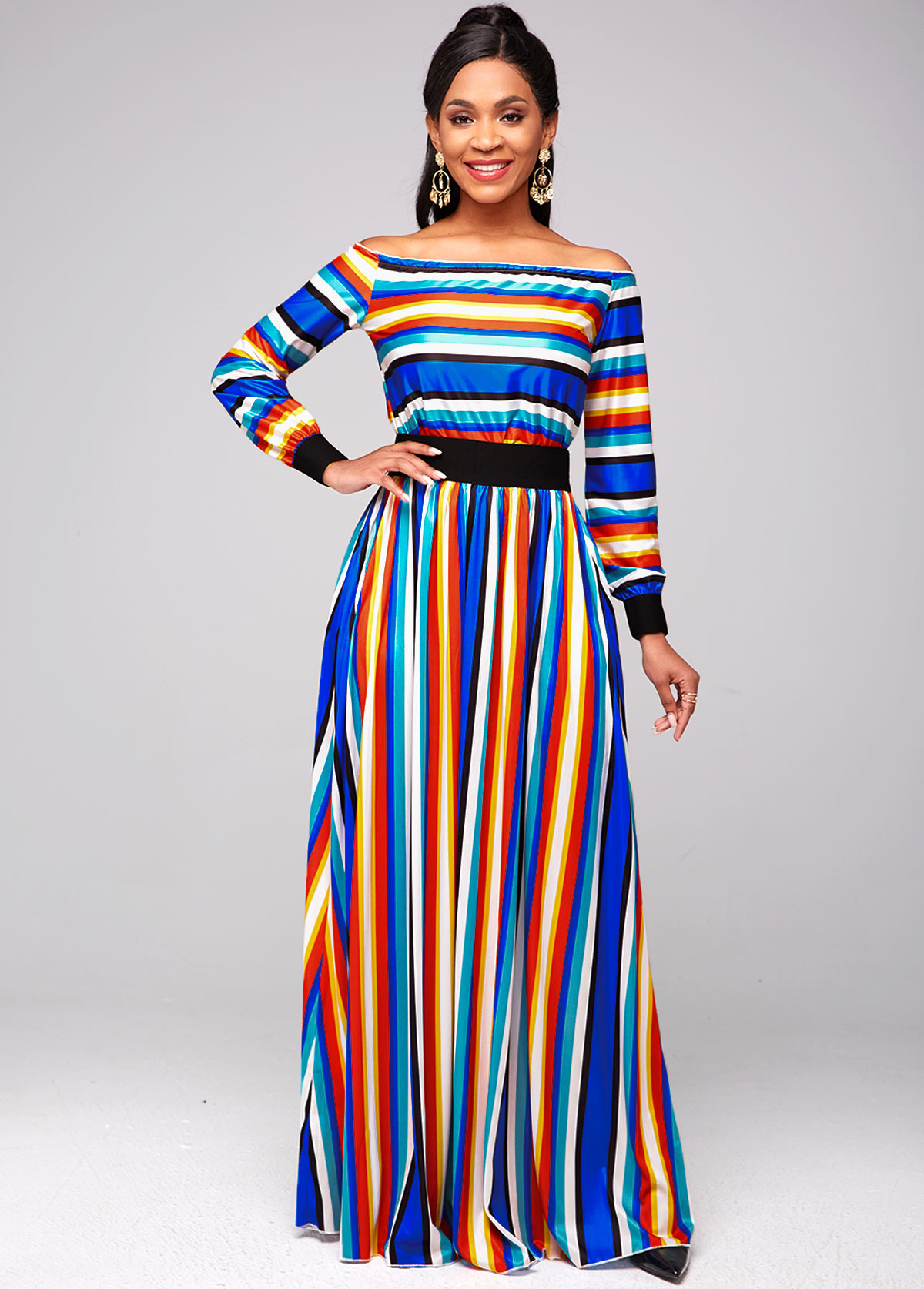 Off Shoulder Top and Rainbow Color Striped Skirt