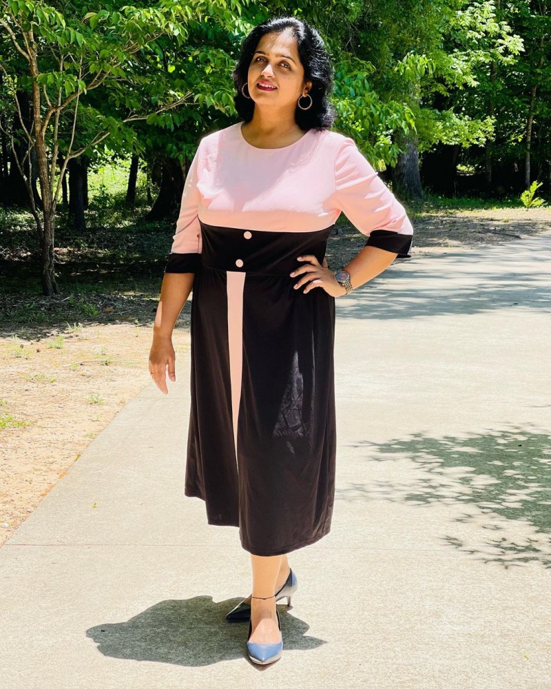 • Pink High Waisted Faux Two Piece Round Neck Dress