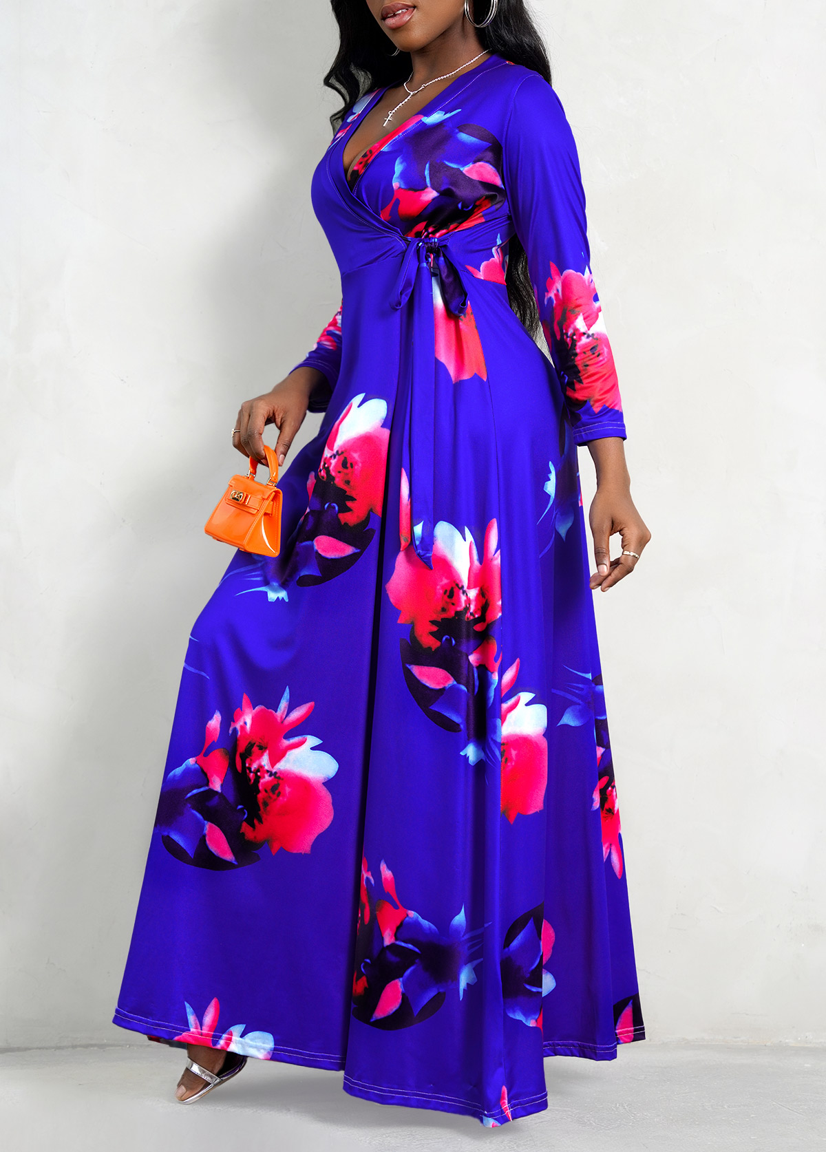 • Purplish Blue 3/4 Sleeve Floral Print Dress