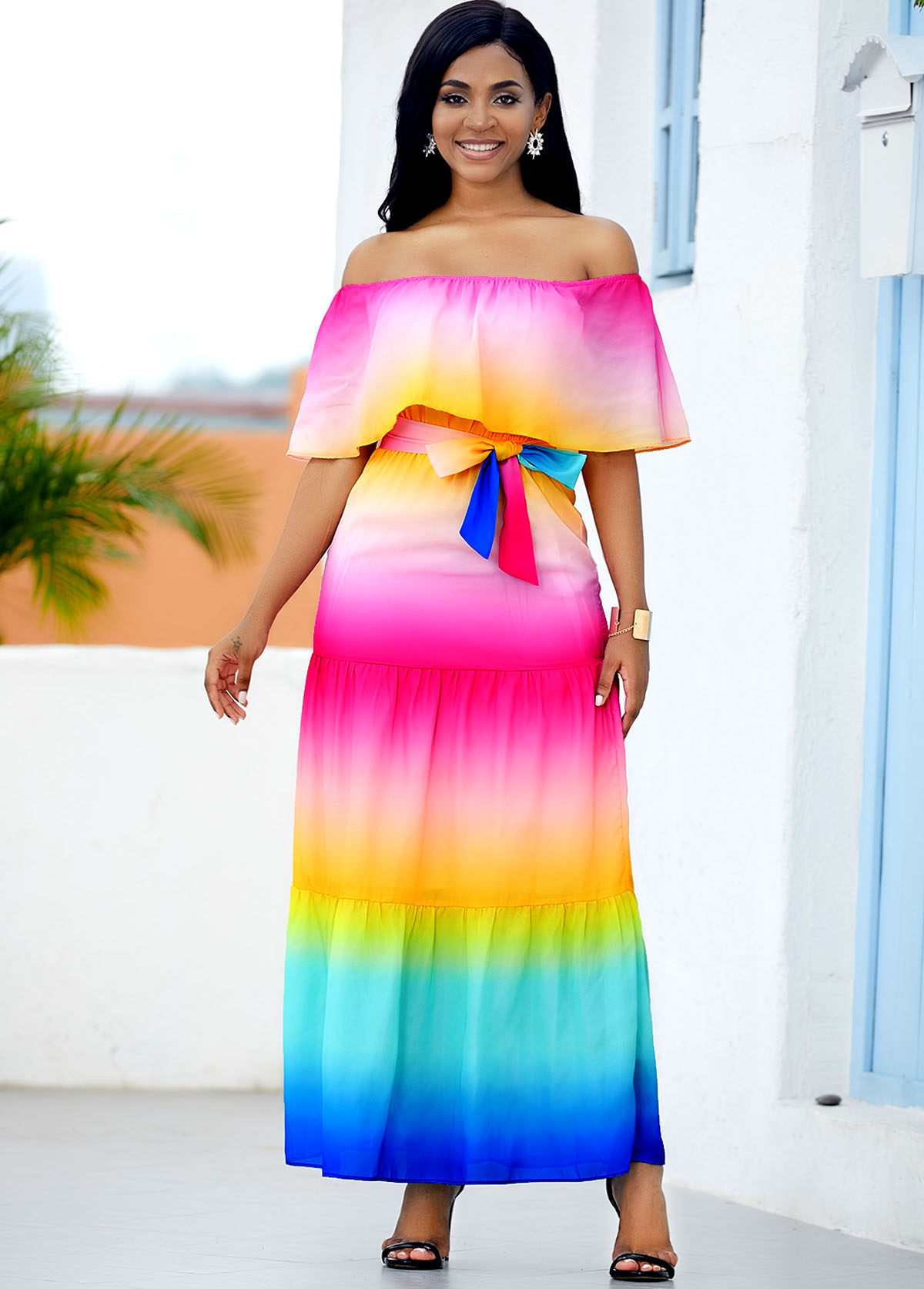• Ruffle Overlay Rainbow Color Printed Maxi Dress