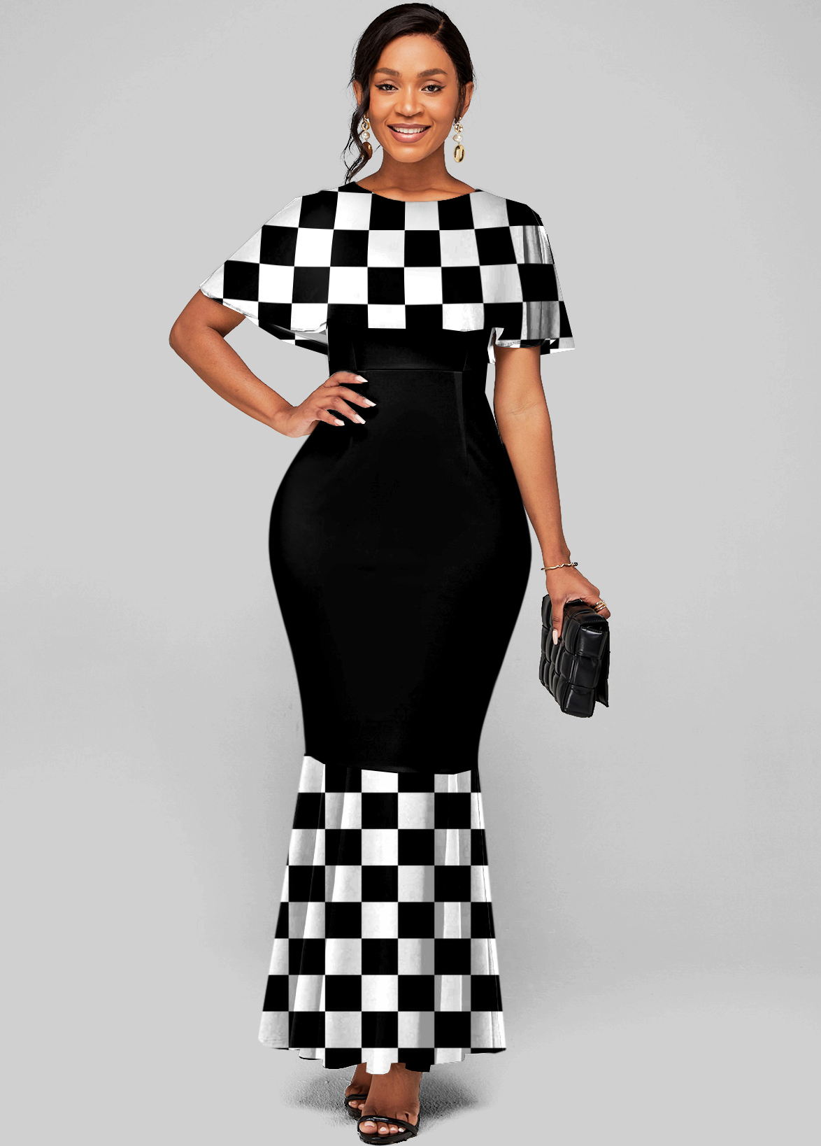 • Short Sleeve Round Neck Checkerboard Pattern Mermaid Dress