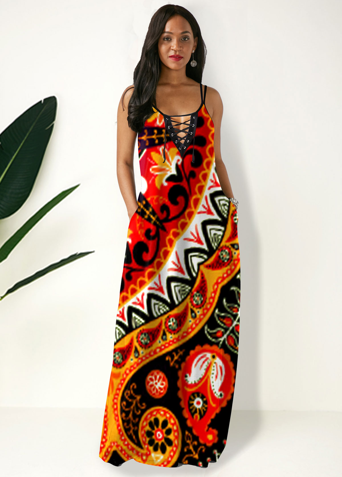 • Side Pocket Tribal Print Spaghetti Strap Maxi Dress