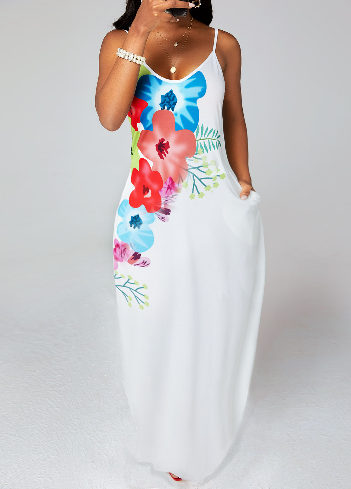 Spaghetti Strap Floral Print Double Pockets Maxi Dress