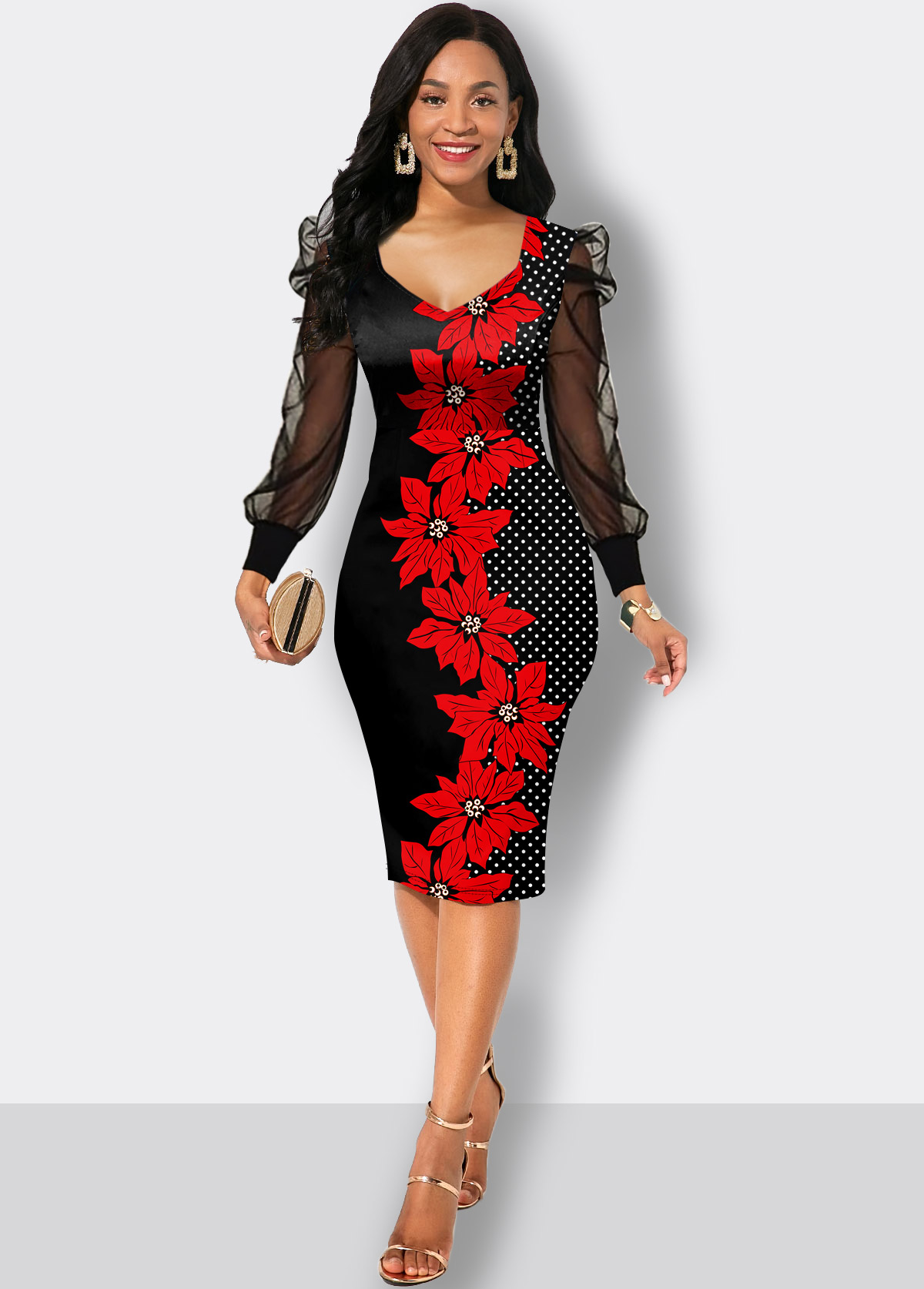 Floral Print Fabric Splicing Long Sleeve Sweetheart Neckline Dress