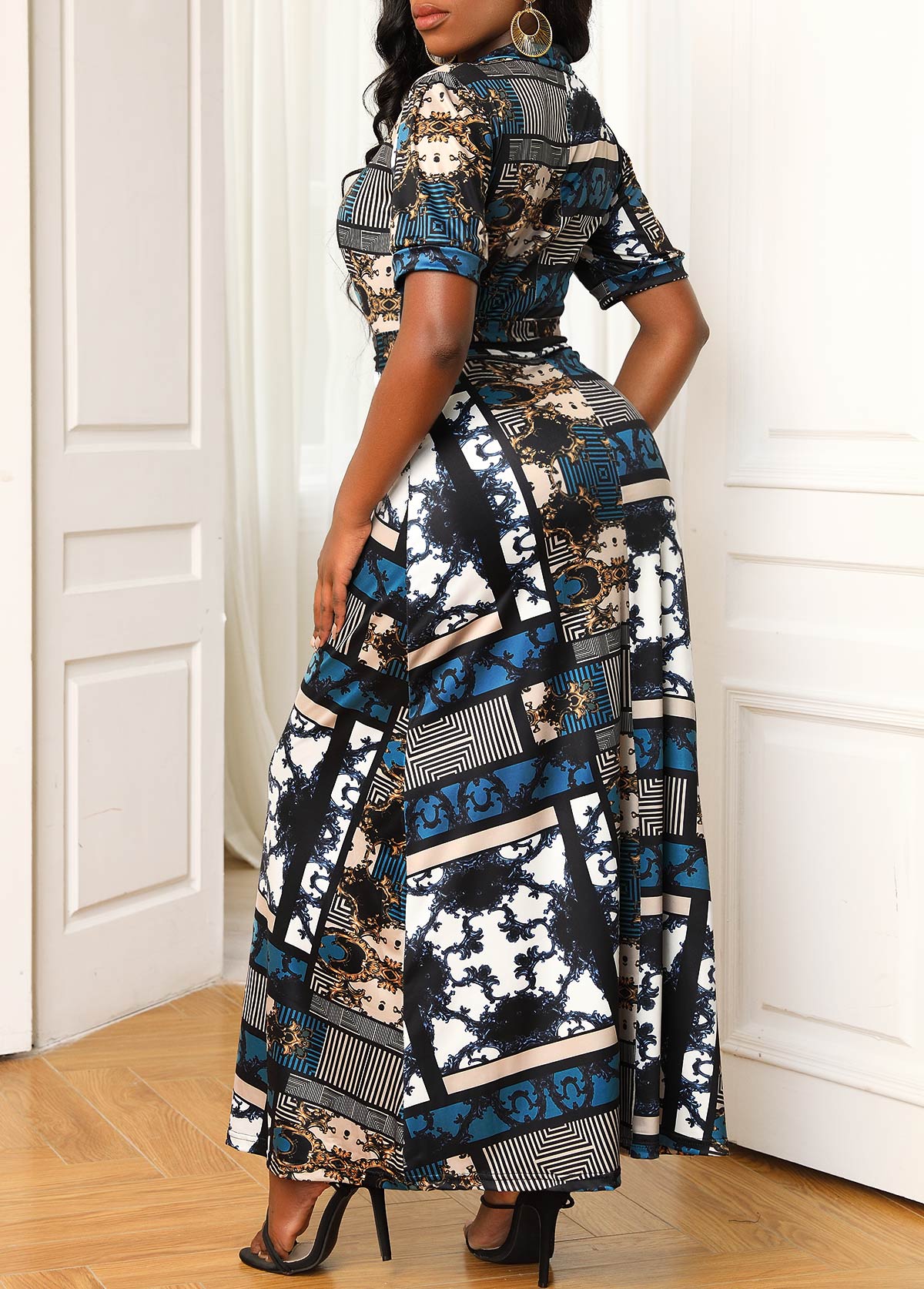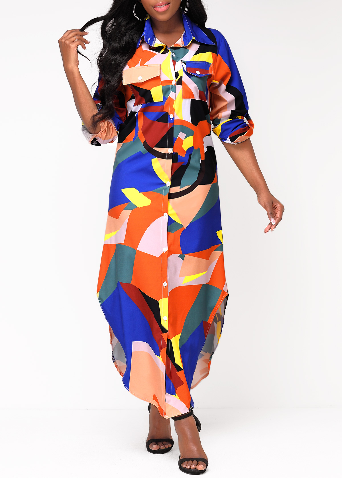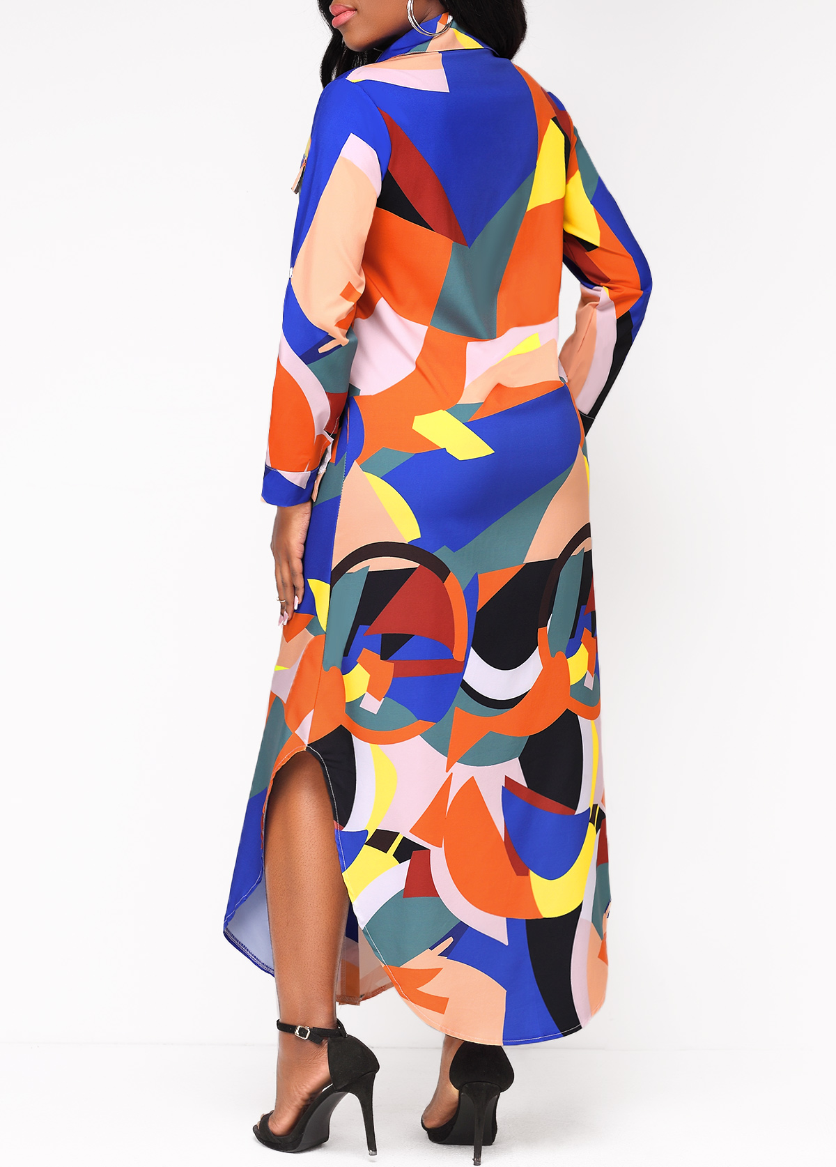 Geometric Print Button Up Long Sleeve Maxi Dress