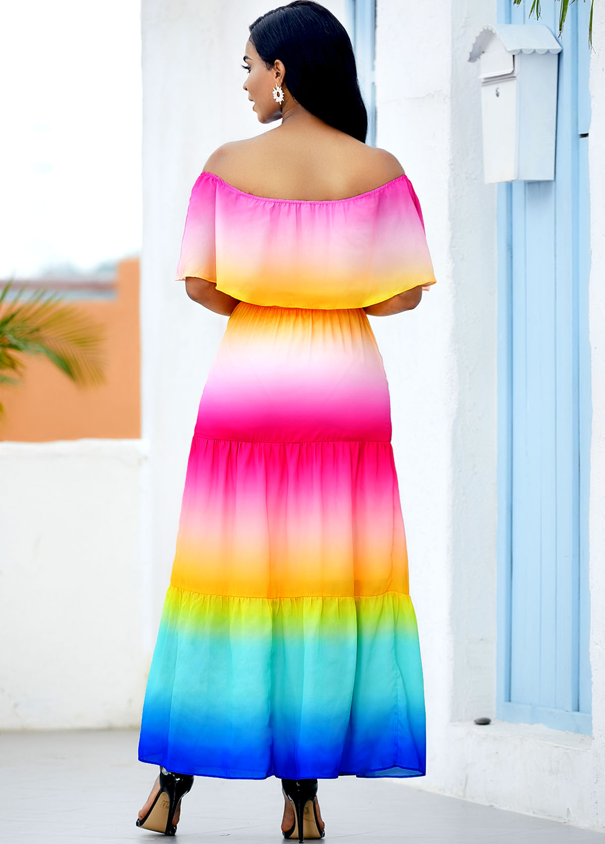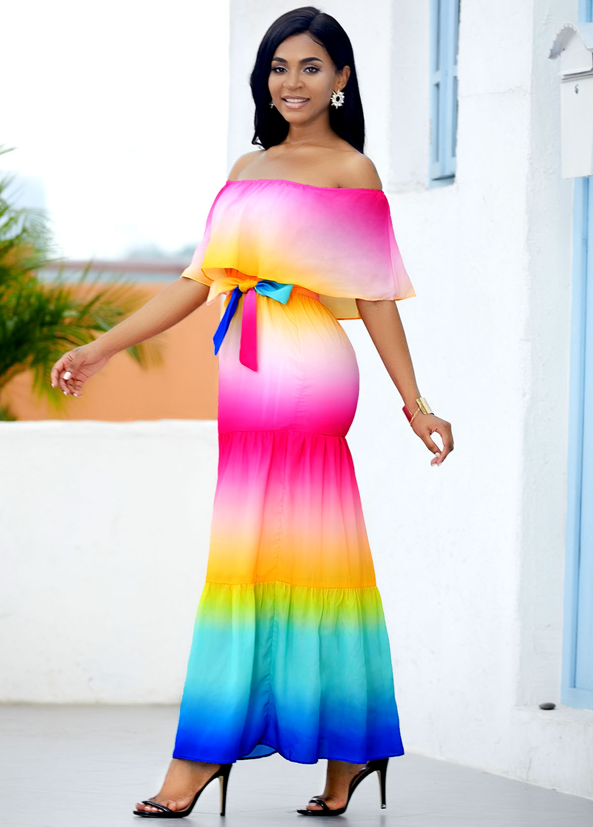 Ruffle Overlay Rainbow Color Printed Maxi Dress